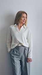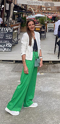 Мне понравились брюки, хоть и не с первого раза😁 Я сшила уже двое. Первые летние из смесового льна в полоску. Когда сшила, оказалось, что слишком высокая высота сидения, за счет этого по ощущениям низко располагается мотня. Но это было первое впечатление, в процессе эксплуатации это оказалось даже плюсом. Вторые бежевые брюки сшиты из костюмной ткани на более холодное время года. Ношу даже зимой, за счет ширины штанин удобно носить с колготками.