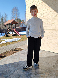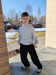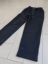 На ребенка ростом 134см ОБ=64см, взяла выкройку 140 ОБ=74. Длину добавила 4см, не смотря на то, что брюки широкие, сидят хорошо. Для регулировки пояса вставила люверсы. Шила из 3х нитки хлопок 100%