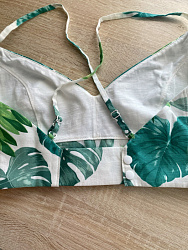 Сшила уже 2 топа по этой выкройке. брала размер 44 (хотя, мой размер 42) из-за полноты груди. Чашка села хорошо, но спинка по выкройке этого размера оказалась очень большая для меня, поэтому нужно было бы по идее корректировать боковые части, но я решила иначе. В одном варианте поставила сразу декоративную резинку без детали из основной ткани, а во втором варианте обошлась вообще без резинки, поставив в качестве застёжки пару пластиковых кнопок. Молочный топ полностью из джерси, средней плотности, топ с растительным принтом из хлопкового сатина (на подкладке у него тонкий хлопковый трикотаж без эластана). Пошив простой и понятный. Хорошая выкройка!