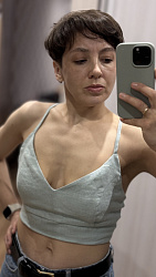 Топ шила из хлопка. Изменила расположение бретелей. Не очень комфортно в нем себя чувствую, размер вроде хорошо.