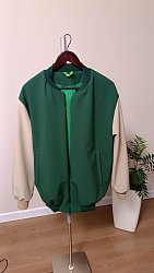 Очень классный бомбер! Ничего не меняла, все село идеально. Ткань курточная белфаст с пич эффектом.