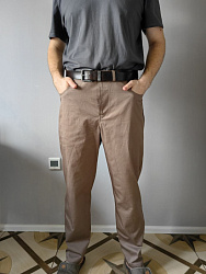 Брюки хорошо, мужу понравились. Описание пошива хорошее, всё понятно. Я новичок-самоучка, сначала шила макет. Мужу оказался мал размер, сшила на размер больше и уже подошло. До этого брала ОБ 109 см. Корректировки не вносила.