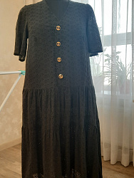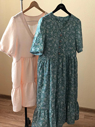 Я новичок в шитье, но по этой выкройке не возникло никаких сложностей, все получилось. Шила из ткани лен с вискозой (30/70), в цвете эвкалипт. Заказывала ее на вб. По каждому волану прибавила по 3.5 см. У меня обхват груди 100, по бедрам 102, рост 162 см. Хотелось платье подлиннее. На 7 месяц беременности идеально. Думаю, буду носить до самых родов, очень свободное и удобное. Прорези для пуговиц не стала делать, просто пришила их. Благодарю за выкройку! Рекомендую👍