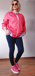 Ношу уже полтора года. Бомбер получился тёплый, мягкий и уютный. На мой взгляд, немного широковата горловина. В выкройке для маленького роста карманы уходят в пояс. Нужно либо уменьшить длину кармана, либо поднять рамку кармана вверх. Жаль, что я на это обратила внимание уже в процессе. В остальном всё хорошо, описание понятное.