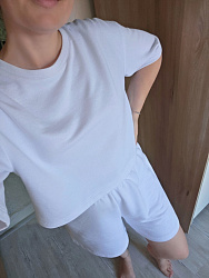 Супер простоя выкройка. Футболка отличная вышла. Ношу с удовольствием. Собрала костюм из этой футболки и шорт Арна. Ткань двухнитка.