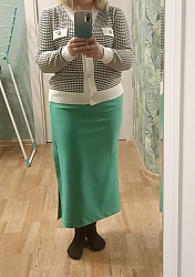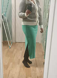 Юбка хорошая, прямая. Я на свои широкие бедра с осторожностью подхожу к трикотажным юбкам. На фото вроде даже неплохо смотрится. В любом случае, с длинным кардиганом, например, можно носить) Или выбрать трикотаж поплотнее, чтобы не выделял мои "достоинства": )