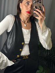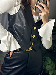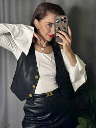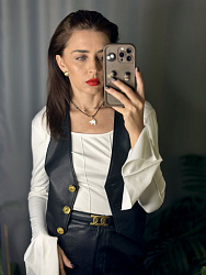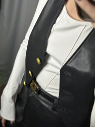 Классная базовая выкройка жилетки! Шила из экокожи. Добавила отстрочку по швам и периметру, сделала петли в рамку и акцентные пуговицы)) Единственная сложность возникла с подкладкой-со стороны спинки вверху ее как будто бы не хватало по бокам из-за защипа, сделала без защипа и все встало на свои места. Нет карманов и других сложных деталей-это плюс, шьется довольно быстро))