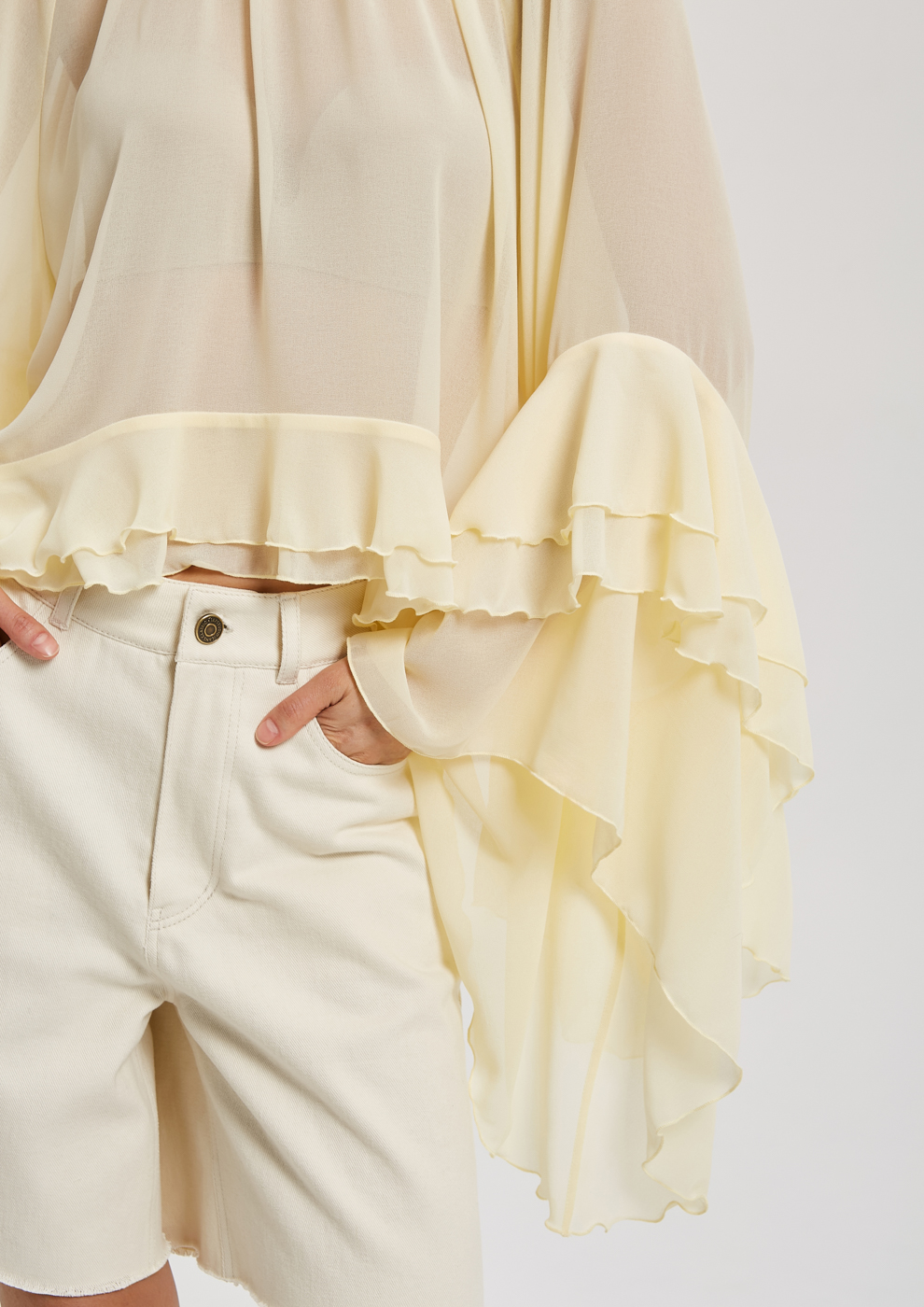 Я сразу влюбилась в эту выкройку, как только увидела🙂 Думала сшить в каком-нибудь другом цвете, но не смогла отказать себе в удовольствии выглядеть как завитушки масла на хлебе😄 Обработка воланов роликовым швом - воздушно и нежно💛 В общем, пошивом и выкройкой очень довольна!