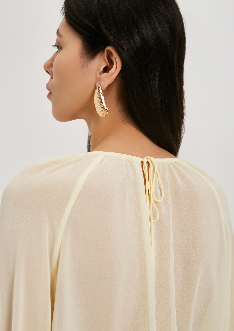 Шьется легко. На спине дочь завязала блузку в расслабленном варианте (попыталась передать на фото), и мне так больше нравится, чем затянутость на шее.