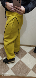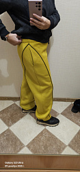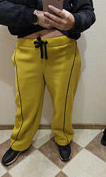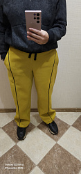 Футер 3х нитка начёс, цвет горчица. Добавила кант, очень люблю его. На бытовом оверлоке сложновато было прошить соединение канта над карманами. Низ сделала с шляпной резинкой с фиксаторами. Посадка очень понравилась. Брала выкройку на ОБ 98, чтоб совсем большие не были. Подкладку кармана на передней половинке сделала из чёрной кулирки,