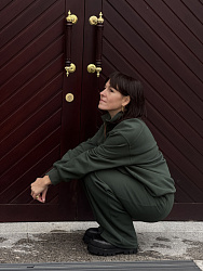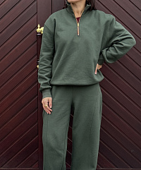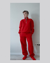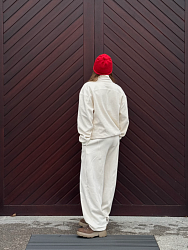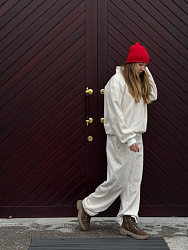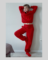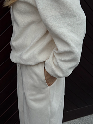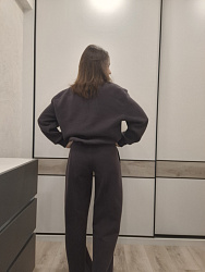 Здравствуйте. Брюки шились на одном дыхании. Брала размер в размер. Трехнитка(без начёса), выкройка села идеально. Отшивала все по инструкции, кроме пояса. Сначала сделала кулиску, а потом вдевала резинку, чтобы размер резинки подошёл наверняка 😀 получился отличный костюм, обязательно отошьем и в другом цвете. Спасибо.