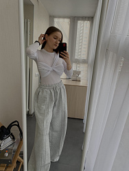 Спасибо, что поделились опытом. По вашему описанию сложно определить причину — для понимания посадки нам очень нужны фото примерки, без них мы не сможем корректно прокомментировать ситуацию. Модель этих брюк изначально рассчитана на посадку на резинке — при разнице между вашим фактическим обхватом талии и таблицей размеров изделие действительно может давать излишнюю свободу по линии талии. Если сможете, пришлите, пожалуйста, фото примерки — так мы точнее разберёмся, что происходит именно в вашем случае.