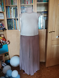 Брюки шила изо льна с вискозой. На комплект с туникой пошло 4 метра. Брюки шила без подкладки. Чуть укоротила, а зря, верну длину по выкройке. Пояс дублировала трикотажным флизелином. Опасалась, что брюки будут слишком широкими, но благодаря пластичности ткани они смотрятся очень хорошо.