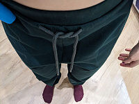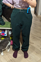 Брюки шила из футера 3-х нитки с начёсом с эффектом велюра. На ОБ 104 взяла размер 102, корректировок не вносила. Вместо люверсов отверстия для шнура обработала, как под пуговицы.