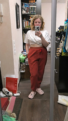 Мне понравилась выкройка, хороший правильный объем, не узкие и не широкие - база, интересный пояс, классные карманы. Для меня, как обычно, великовата высота сидения. Сейчас не правила, а в другой раз уменьшу, но у меня на брюках часто так.