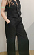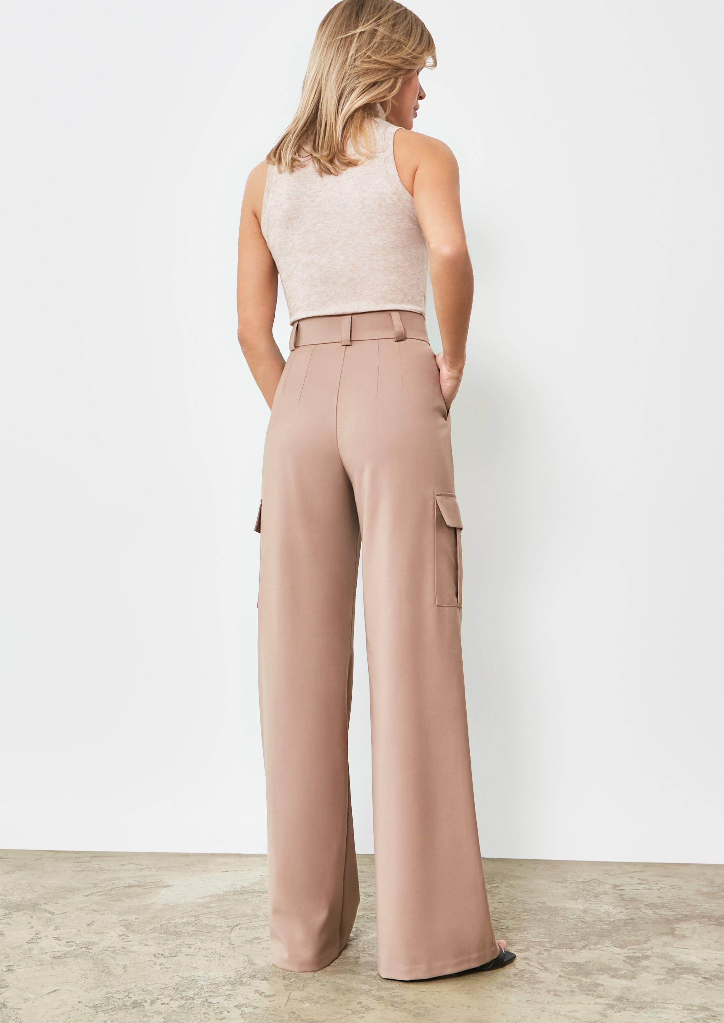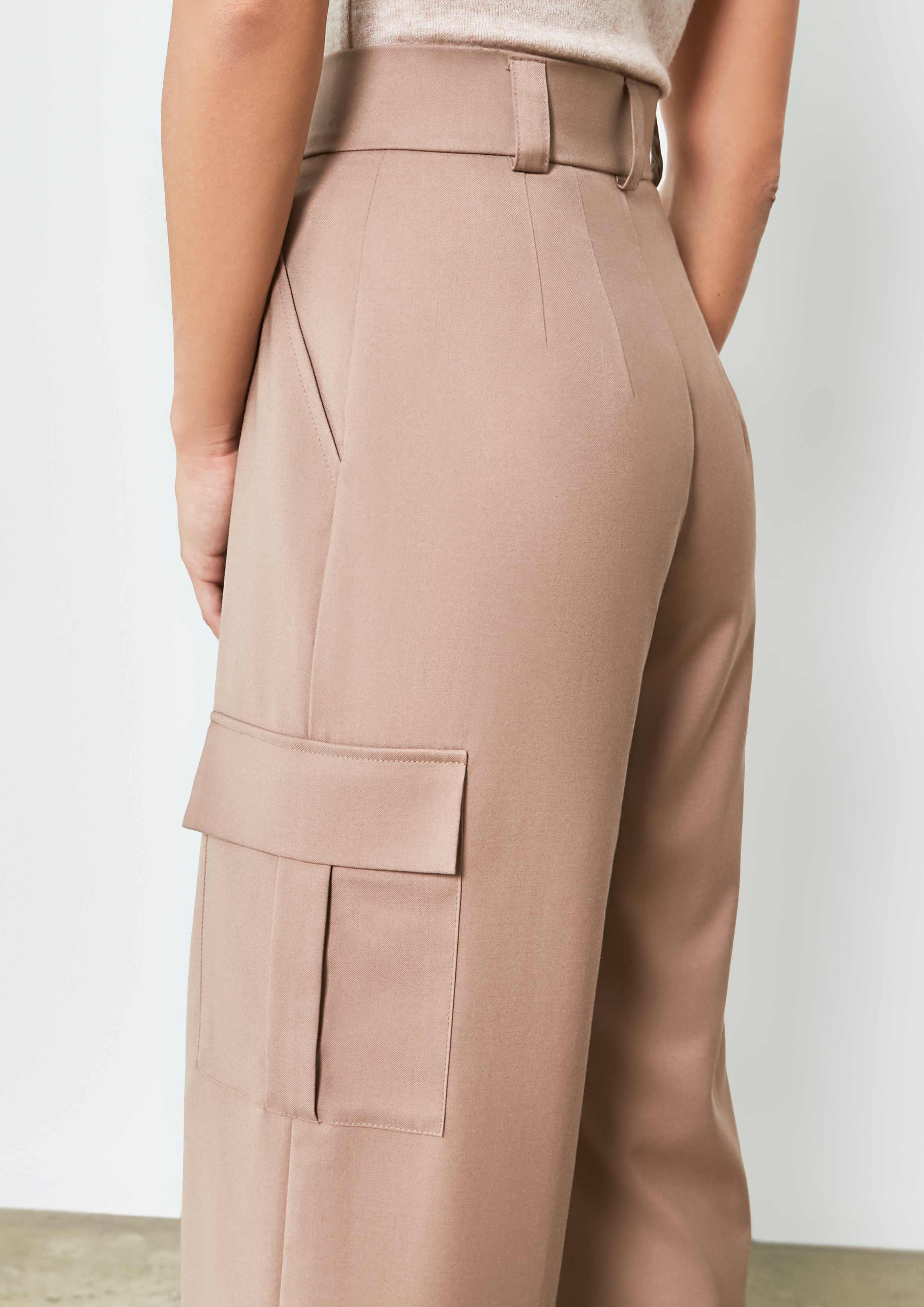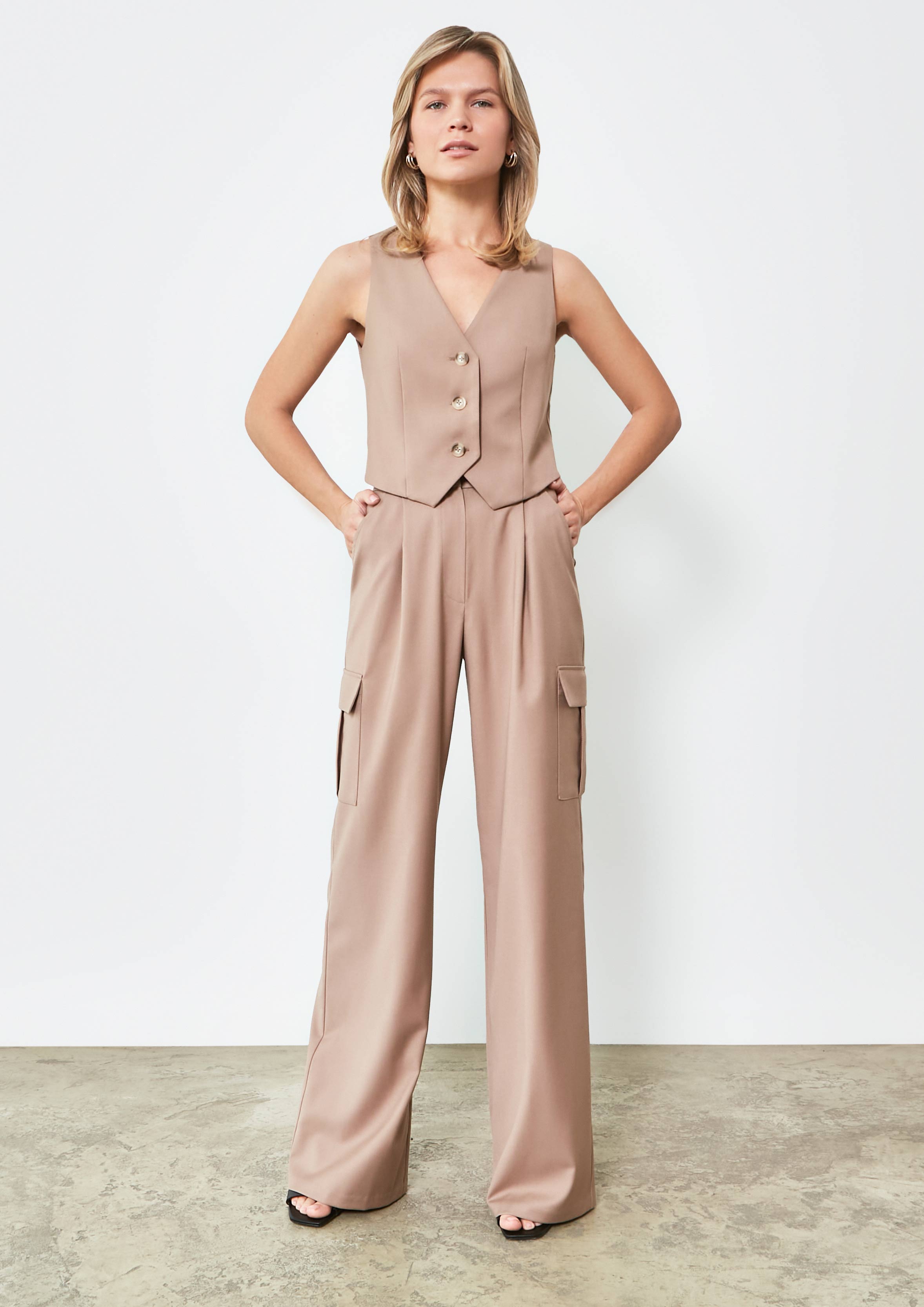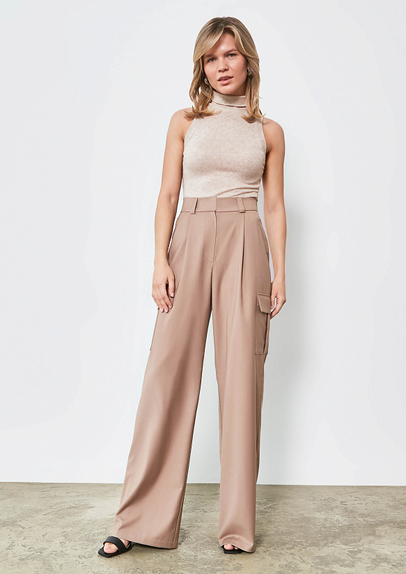 Брюки прямого силуэта большого объема на притачном поясе. На внутренней части пояса выступ, Застежка на одну потайную пуговицу и два крючка. На поясе 4 шлевки. На передних половинках заложены складки, направленные в сторону бокового шва. В боковых швах наклонные карманы. На задних половинках талиевые вытачки. В области колена боковые накладные карманы с клапанами.