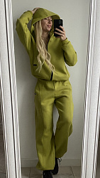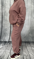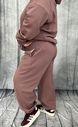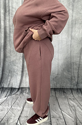 Здравствуйте. Брюки шились на одном дыхании. Брала размер в размер. Трехнитка(без начёса), выкройка села идеально. Отшивала все по инструкции, кроме пояса. Сначала сделала кулиску, а потом вдевала резинку, чтобы размер резинки подошёл наверняка 😀 получился отличный костюм, обязательно отошьем и в другом цвете. Спасибо.