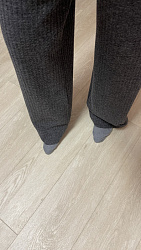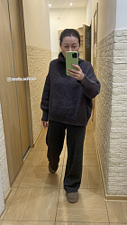 Затем решила сшить из евроангоры, сначала светлые- их я заужала к низу, -6см. Потом уже темно-серые сшила, у них убирала-8см. Из-за особенностей ткани, длину убирала везде, и все равно до пола))) Для себя поняла, что евроангора(по крайней мере из моей ткани) именно для брюк не подходит, потому что коленки вытягиваются. А так, брюки мягкие, удобные. Выкройка супер, буду шить еще из другой ткани.
