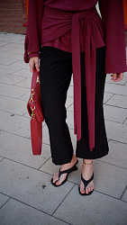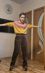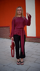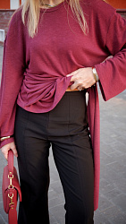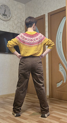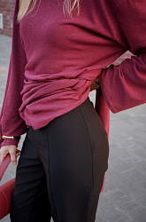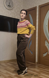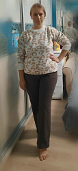 В описании пошива брюки нарисованы ниже талии (на рисунке пупок выше пояса). Когда вырезала выкройку, поняла, что посадка будет высокой. Решила не занижать (как обычно делаю, так удобнее), а оставить как есть, т. к. планировала штаны из шерсти теплые. Поскольку мало швейного опыта, с потайной молнией помучалась. Тем не менее, брюки получились отличные, посадка прекрасная, очень понравилась ширина брючин - и свободные, но не сильно широкие. Укоротила длину, т.к. не ношу каблуки и с плоской подошвой, длина была слишком большая. Точно сошью ещё одни на весну из более тонкой ткани и более низкой посадкой. На фото также Свитер Alisa.
