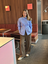 Мне понравились брюки, хоть и не с первого раза😁 Я сшила уже двое. Первые летние из смесового льна в полоску. Когда сшила, оказалось, что слишком высокая высота сидения, за счет этого по ощущениям низко располагается мотня. Но это было первое впечатление, в процессе эксплуатации это оказалось даже плюсом. Вторые бежевые брюки сшиты из костюмной ткани на более холодное время года. Ношу даже зимой, за счет ширины штанин удобно носить с колготками.