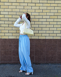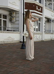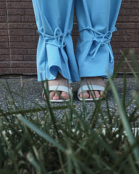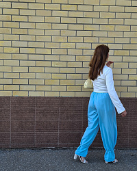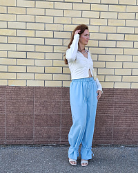 Искала не слишком широкие брюки, и тут все сложилось: нашла рубашку Renso, а к ней как раз эти брючки. Шилось легко, пришлось убрать немного длинны, также не вставила шнурок, вообще не стала делать кулиску. Пояс вообще пока ещё мучаю. Резинка сгибается и все тут. Наверно буду прострачивать вдоль. Очень классно и в расслабленных луках и с каблучками))