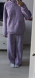 Шила из футера 3н начес. Никакие корректировки не вносила, нравится, что штаны широкие. Внизу еще хочу сделать кулиску, чтобы можно было затягивать низ штанины. Однозначно буду шить еще по этой выкройке.