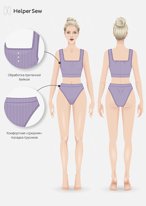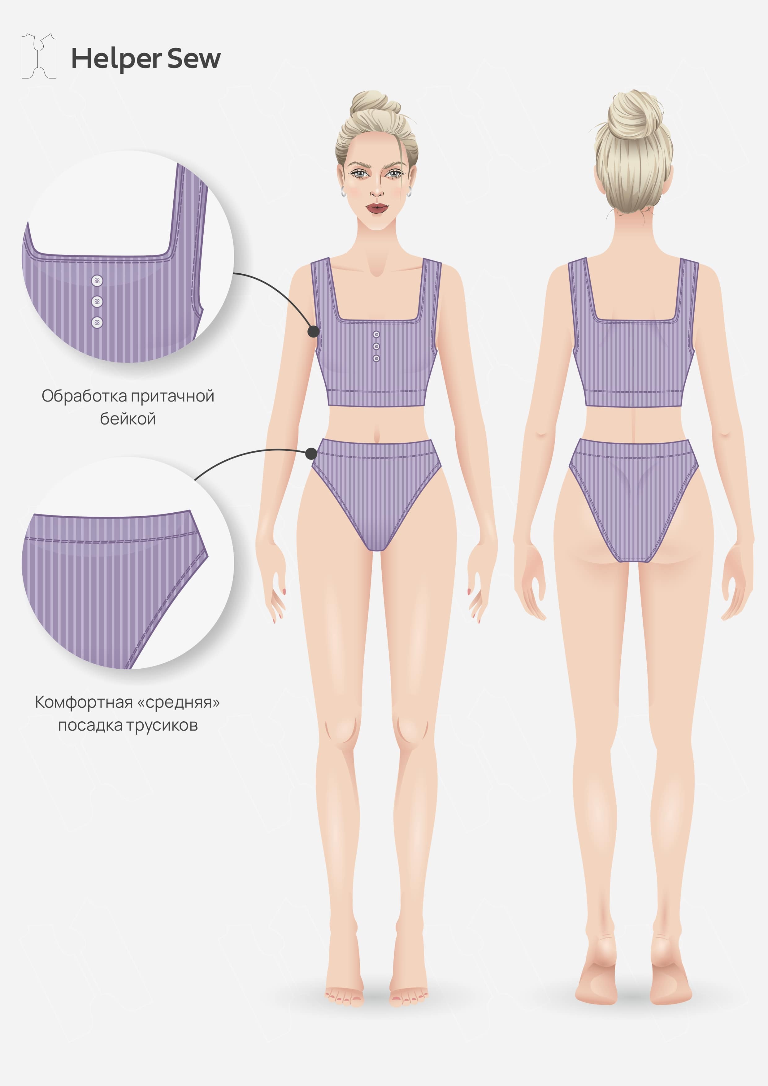 Это была первая выкройка, купленная здесь. Сшила по выкройке комплект, но не сел. Потребовались изменения: лямки у топа укоротить и высоту трусиков убавить. Но это для меня так потребовалось.