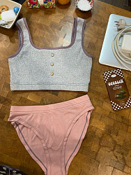 Не знала, как потратить остатки кулирки и решила сшить топик и трусы. У меня не оказалось резинок нужных. Только бельевая, которая для простыней, для резинки. Вышло не очень красиво (я новичок), но мне очень удобно в этом комплекте. Я думаю, что если сшить ещё пару раз, то будет гораздо красивее. Пока так)