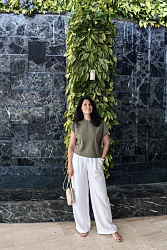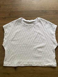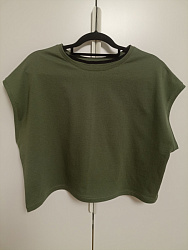 Сшила футболочку из фактурного трикотажа, было всего 60 см. Добавила пояс и манжеты из рибаны. Получилась отличная летняя кофточка. Широкие проймы совсем не смущают, наоборот, дают свободу движения. К тому же я ношу не на голое же тело. Так что ничего лишнего не видно. Спасибо за выкройку!