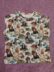 Отличная футболка, оригинальный дизайн. Покупала размер в размер, никаких корректировок не вносила. Шьётся очень быстро. Согласна с комментариями, где написано, что пройма достаточно глубокая, нужно либо быть готовой к этому, либо корректировать под себя. Я оставила как есть, меня это не напрягает.