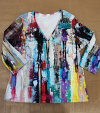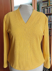Хорошая выкройка и первая моя футболка с треугольным вырезом. Рукав удлинила до 3/4, до локтя длина мне не идет. И к длине футболки добавила +7 см(как я обычно ношу). Прекрасная инструкция, без нее я с обработкой горловины не справилась бы. Футболка получилась красивая. Вырез достаточно глубокий. Рукава на месте. Но для себя поняла, что больше треугольный вырез шить не буду :). Мороки много. И для 54 размера футболка слишком обтянула и спина выглядит не красиво.