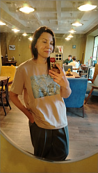 Отличная футболочка! На ог 88 взяла размер 44. Ношу все лето, удобные . Их отшила уже 3, 4я на подходе. Спасибо огромное за базовую выкройку.