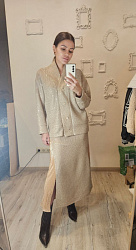 Сшила кардиган из вязаного трикотажа. Изменений в лекала не вносила. Планку дублировала полностью, т. к. трикотаж при частичном дублировании дает усадку. Застежку сделала из магнитных кнопок, сверху пришила пуговицы как декор. В комплект сшила юбку по выкройке Enid, слегка перемоделировала.