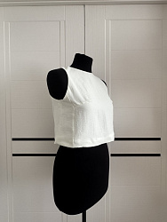 Я давно искала подобную вещь: лаконично, широкие лямки, простой пошив. Процесс шел довольно легко до момента соединения основного изделия с подкладом. Крутила и вертела, соединяла несколько раз - все не то. Хотя, данный маневр совершала ранее в других изделиях. После третьей попытки я сдалась и сделала ее "отлетной". Если сомневаетесь в своих силах, рекомендую не тратить время и сразу делать ее именно такой) Но тут кому как. В остальном, сама выкройка очень понравилась. Расход минимальный! Я уместилась в какой-то крооошечный кусочек 50-55 см. Да, топ укороченный, но я такой и искала. Думаю, что еще обязательно вернусь к выкройке и сошью из других тканей.