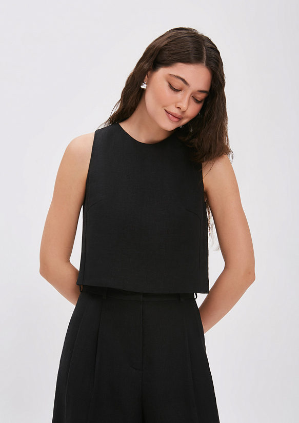 Топ шила без примерок и корректировок из плотного льна с тенселем. Село отлично. Подкладку решила не ставить. Понравилось, что в выкройке есть отрезной бочок, благодаря этому сидит не плоско на груди. Возможно, длину можно было бы сделать меньше, если шить с шортами Габи, но я топ планирую с джинсами носить, поэтому оставила так.