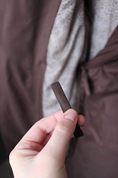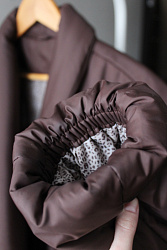 Это был мой первый осознанный пошив верхней одежды. Выбрала эту модель, потому что она без молнии и кнопок, а только завязки. Я решила не мучаться с их выворачиванием, а просто сшила их потайным стежком.