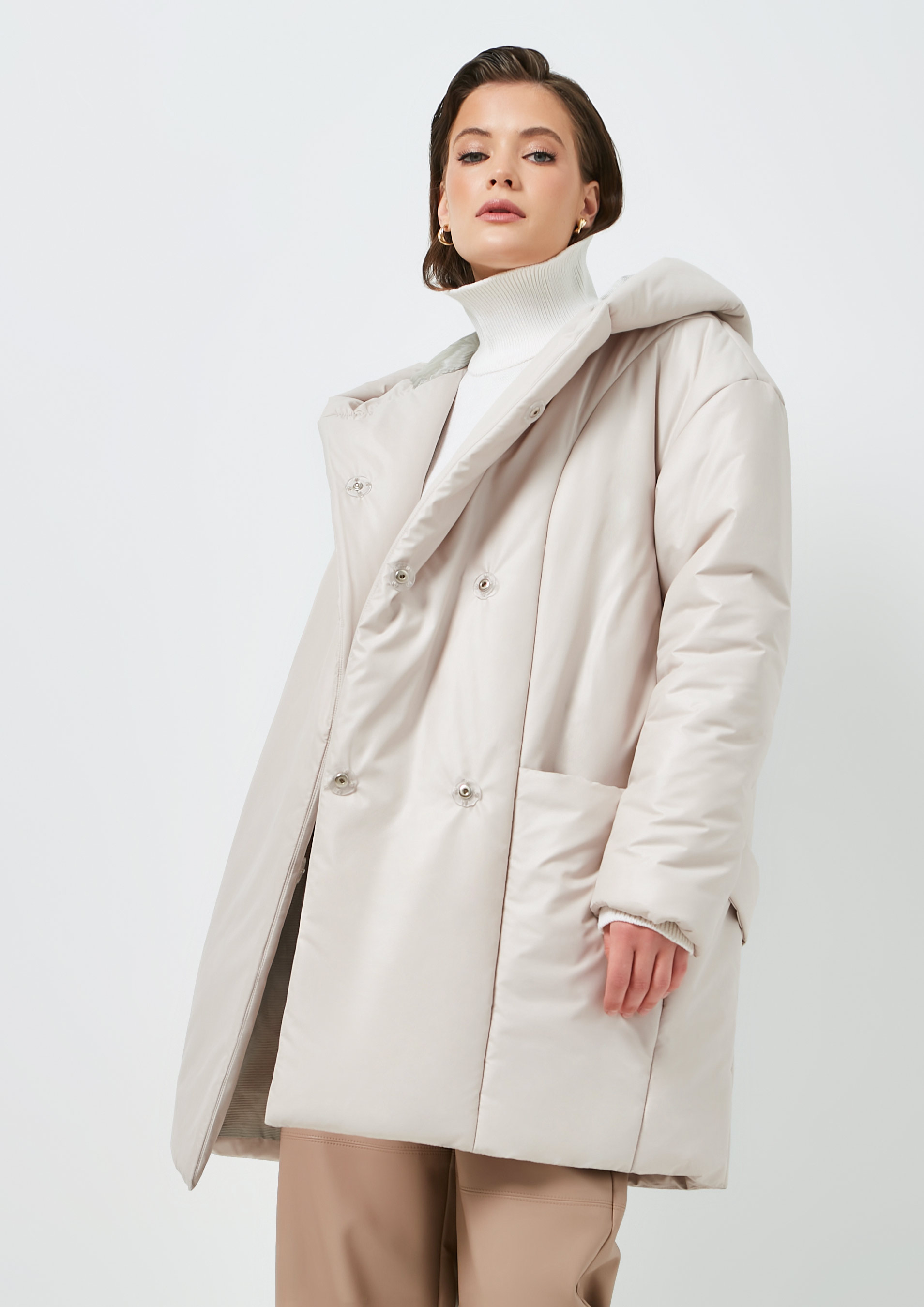 Для верха взяла плащовка дюспо, она непромокаемая. Внутри утеплитель isosoft 100, так как эту куртку планировала носить не в сильный холод. Кнопки вручную пришивала, второй сезон ношу и ничего не отлетело.