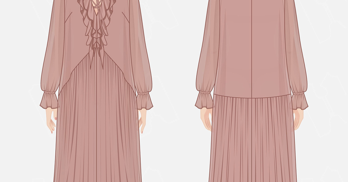 Платье большого объема прямого силуэта отрезное по фигурной линии, длиной макси. Нижняя часть изделия со сборкой, с перепадом длин. Перед со средним швом, нагрудными вытачками , с V-образным вырезом горловины. Горловина переда и спинки оформлена воланами. По вырезу переда расположены навесные петли, в которые продет шнур. Спинка со средним швом. Рукав втачной одношовный длинный. Низ рукава с притачной манжетой, в шве притачивания выполнена кулиска, внутрь которой вставлена эластичная лента. Низ платья и рукава обработан московским швом. Воланы обработаны роликовым швом. Платье на отлетной подкладке длиной ниже колена.