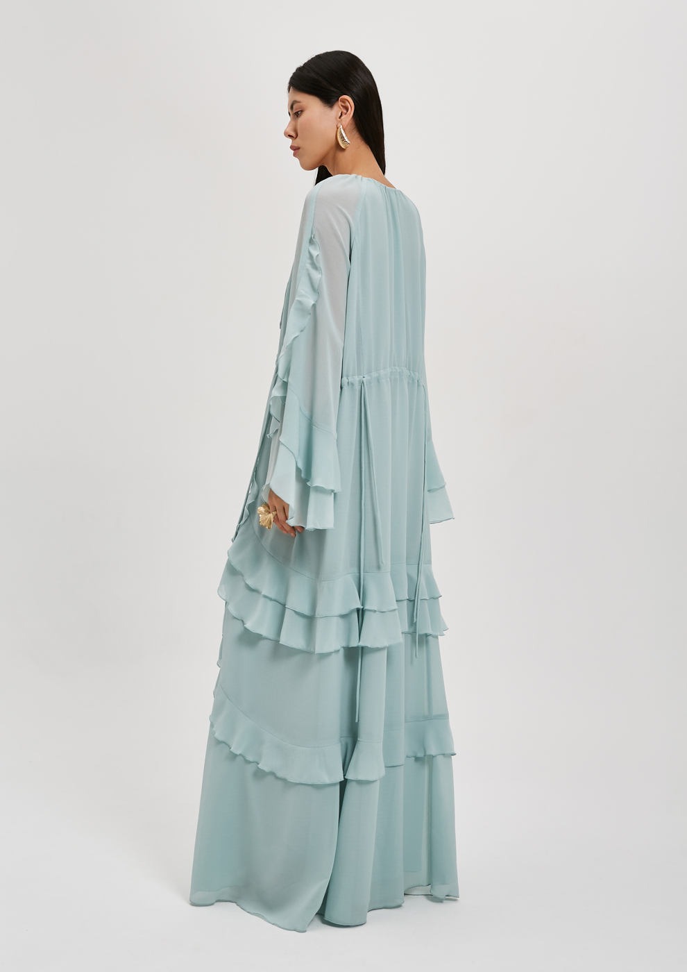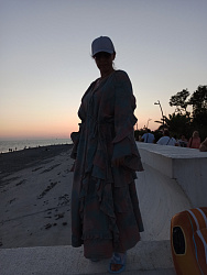 Сногсшибательное платье 👗 🐬🌊💫 Сразу, как увидела этот муслин, представила пальмовый берег. День кроила, два шила. Корректировала длину, минус 30 см, в каждом ярусе по 10 см. Чтобы комфортно было ходить, ткань тяжелая, такая длина для этой ткани лишняя, от подклада отказалась, широкая обтачка по полочке. В клин добавила рюшечку поперек. Расход при ширине 240 уложилась в 3,5 метра. Девочки, шейте обязательно, больше пугает раскрой, но собирать эту красоту очень интересно. Примерка юбки и рукавов просто восторг 💓🌷 Спасибо за выкройку 💃❤️