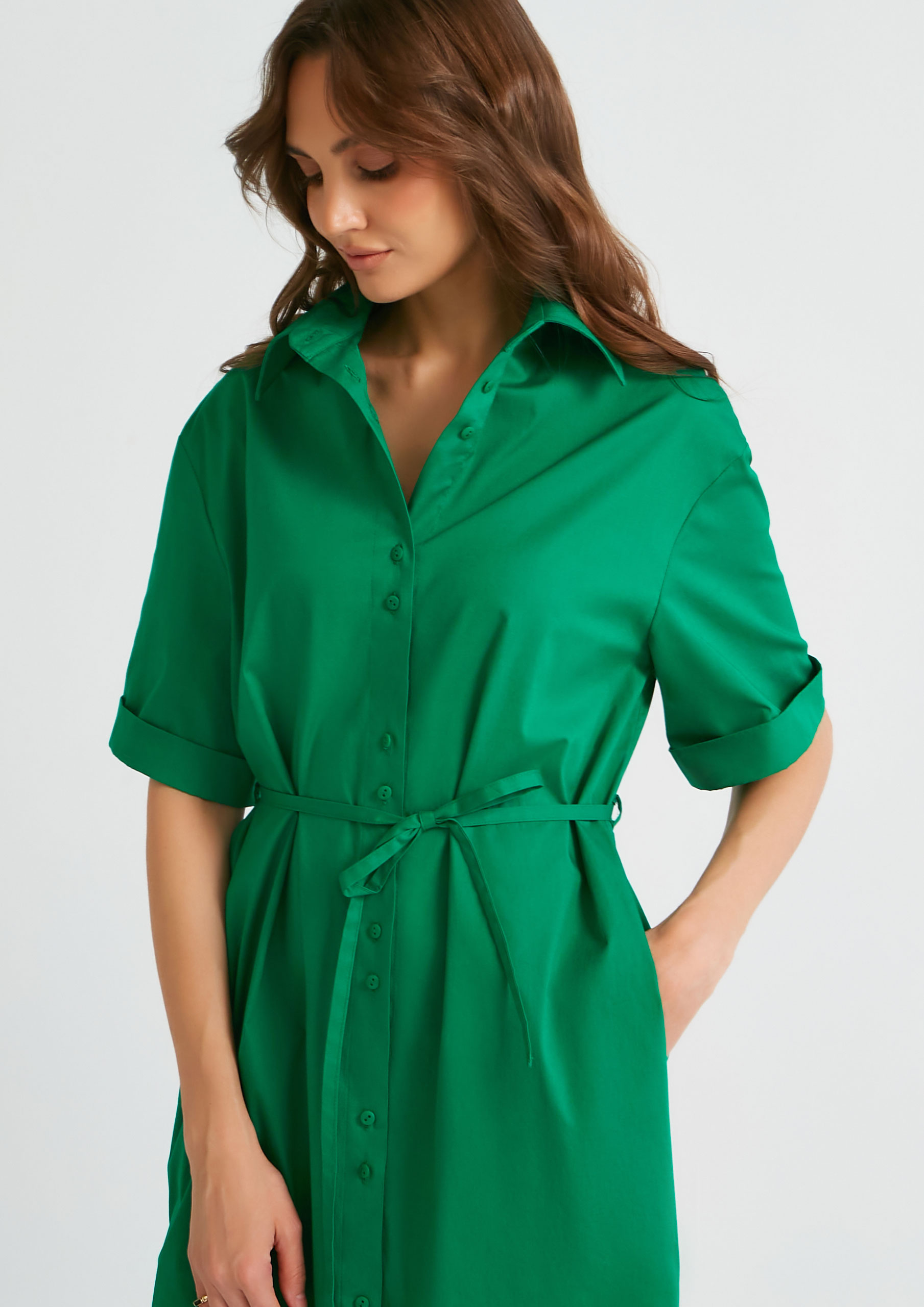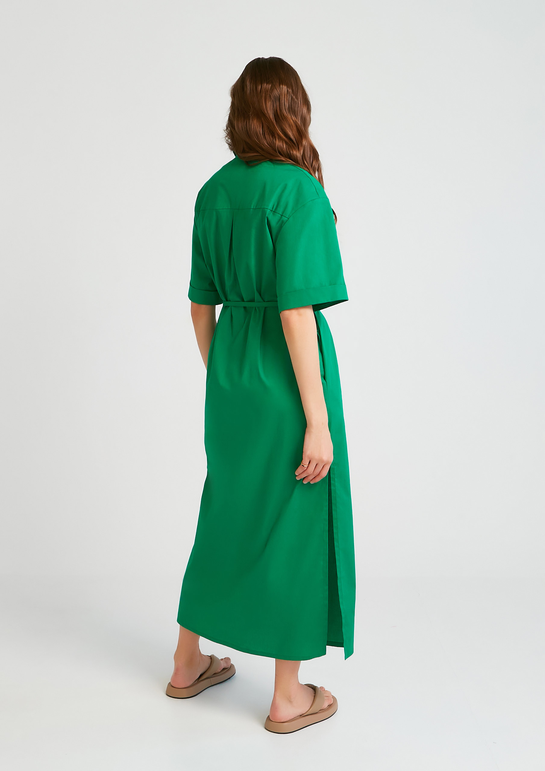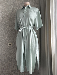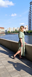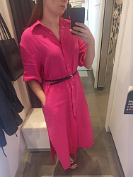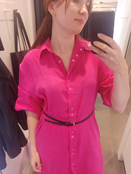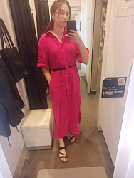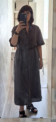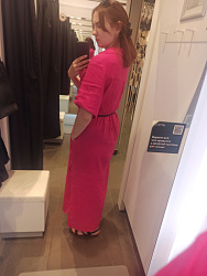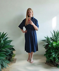 Платье по выкройке получилось удобное. Для офиса летом отличное. Брала на 1 размер меньше по ОГ. Шила изо льна с вискозой. Из изменений только увеличила мешковины карманов, вместо пояса из ткани подобрала тонкий ремешок и вместо пуговиц поставила рубашечные кнопки.