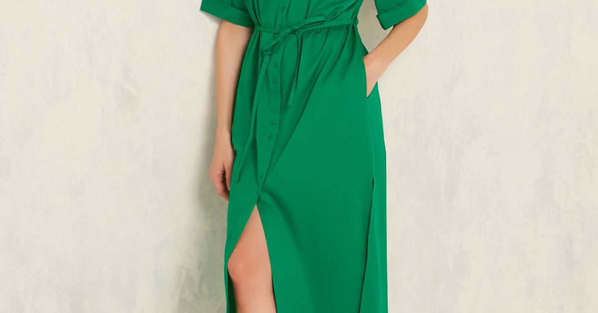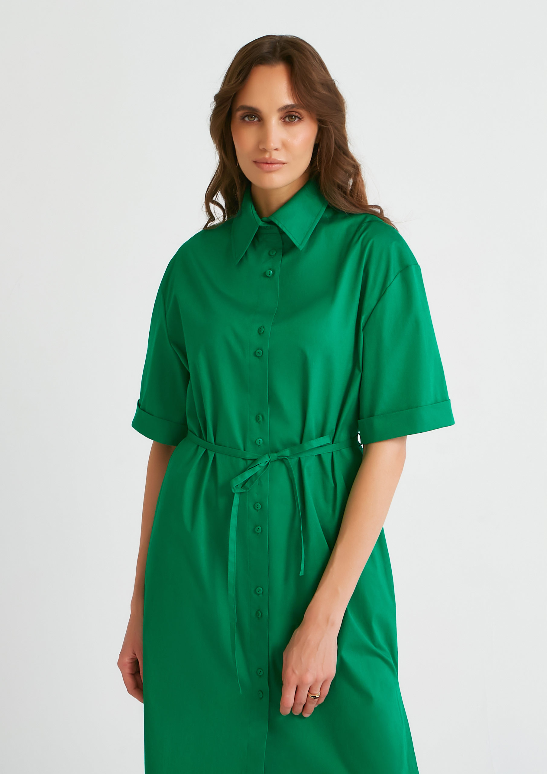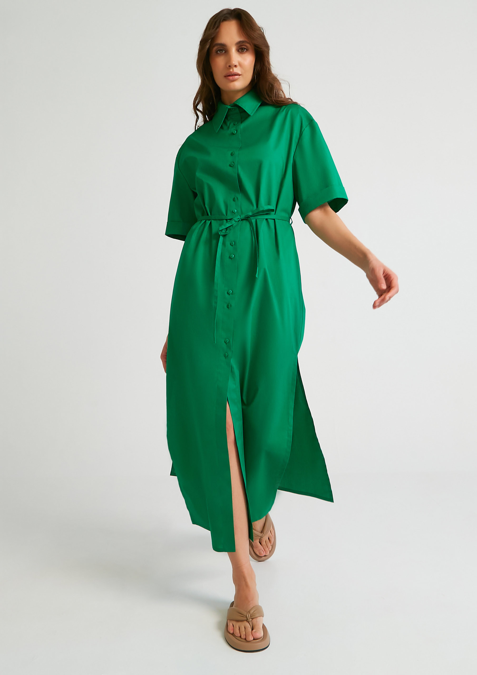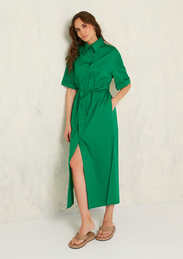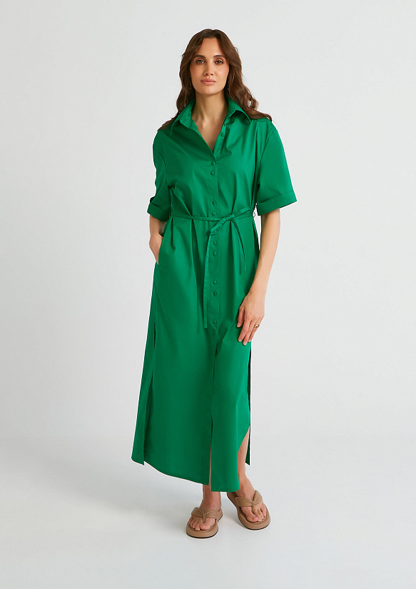 Отличная выкройка! На свои ОГ 101, ОБ 106, рост 174 беру 48 размер, всегда все по размеру. Это платье шила из костюмной вискозы. Ткани было только 2 м, поэтому немного укоротила низ. Планку сделала только 35 см, не во всю длину платья. Рукава без отворота. Планку, воротник, разрезы, подгибку, пояс отстрочила контрастной нитью.