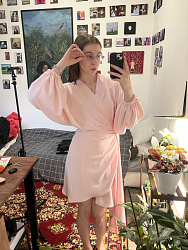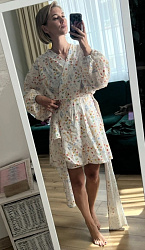 Брала эту выкройку для новогоднего образа. Шьется легко. Правда ткань я взяла тонкую, немного запарилась с манжетами, что в итоге их изменила. Платье комфортное, выглядит как праздничное домашнее кимоно.