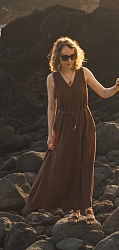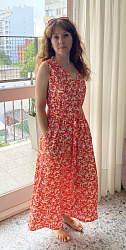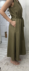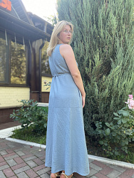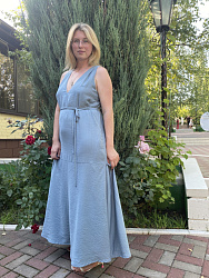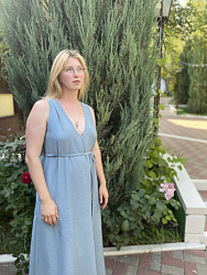 Выкройку покупала своей полнотной группы. Шил виз льна борзо на подкладке из батиста. Платье очень удобное. Разрешение впереди аккуратный. Когда наклоняешься, то ничего лишнего не видно. Сам фасон удобный.