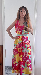 Это моё первое сшитое платье. Шила из тонкой вискозы для жаркого лета. Первое платье делала как тестовое, разбиралась с карманами и обработкой горловины и пройм, так как подкладку решила не делать.