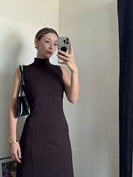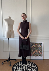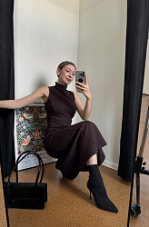 Я сшила его из селаника, трикотаж мягкий, обволакивающий, пружинит при ходьбе, ничего не просвечивает и не выделяется. Довольно много убирала в рельефах по груди и талии, но это может быть из-за того, что селаник сильно растяжим. Шить платье несложно и недолго, но у меня было много примерок, хотелось посадить идеально по фигуре. Очень нравится длина, красиво и с сапогами, и с туфлями