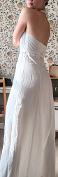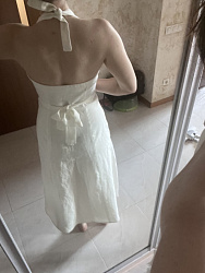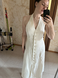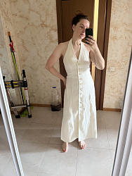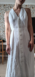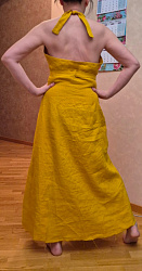 Выкройка платья очень понравилась! Платье село без корректировок по фигуре. Единственное изменение - я лямки пришила к спинке, чтобы его можно было носить с бюстгальтером. Плотность льна 180-200 гр/м3 с эластином. Купила в Реава (арт. 840589, лен Забота). На платье ушли все 3 м льна (ширина полотна 130 см).