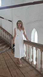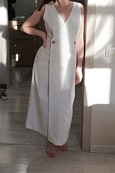Прекрасное платье, очень женственное и элегантное, на небольшой груди вырез смотрится хорошо.Ткань - лен/хопок/вискоза. Спасибо за ваши оригинальные модели и за возможность новичкам шить такие красивые вещи.