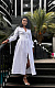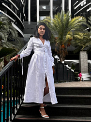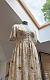Платье полуприлегающего силуэта с двойным притачным фигурным поясом. Горловина V-образной формы, углубленная, обработана притачной бейкой. Верхняя часть переда со сборкой по нижнему срезу. Верхняя часть спинки с талиевыми вытачками. Рукава длинные втачные. По низу рукавов сборка и манжеты с завязками. Разрезы рукавов окантованы бейкой. Нижняя часть платья свободная, со сборкой по талии. Застежка на навесные петли и пуговицы. Платье сшито из отбеленного муслина, состав хлопок 100%, плотность 100 гр/м².