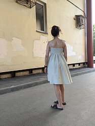 Платье размер 42 сшилось без корректировок по верху. Юбку сделала двойную, ткань - легкий батист, хотелось добавить юбке движения. Длину также укоротила. Уложилась в 2 метра.