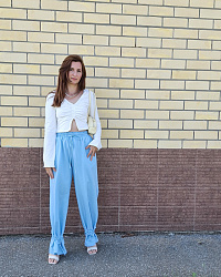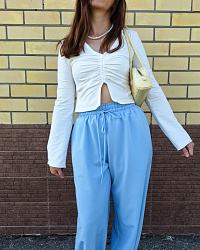 Необычная блуза, когда хочется что-то быстро сшить, но чтобы было эффектно! Сборку на груди можно регулировать с помощью завязок. Я шила на оверлоке и на машинке эластичной строчкой, так как распошивальной машины у меня нет. Шьется очень просто. В комплект к блузке сшила брюки Alfie, но она идеально сочетается и с джинсами. Инструкция супер подробная, так что справится и новичок.